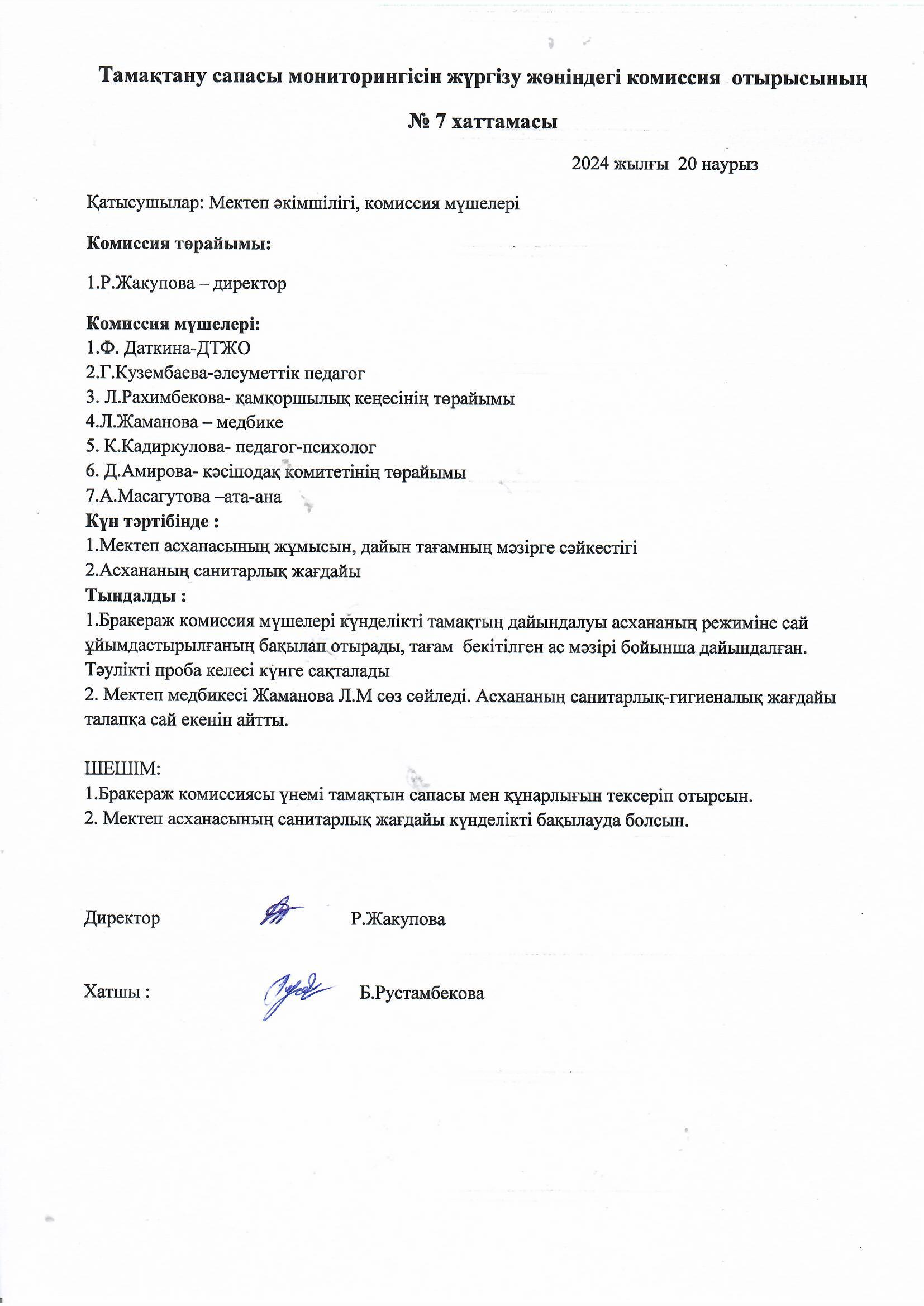 Тамақтану сапасы мониторингісін жүргізу жөніндегі комиссия отырысының № 7 хаттамасы
