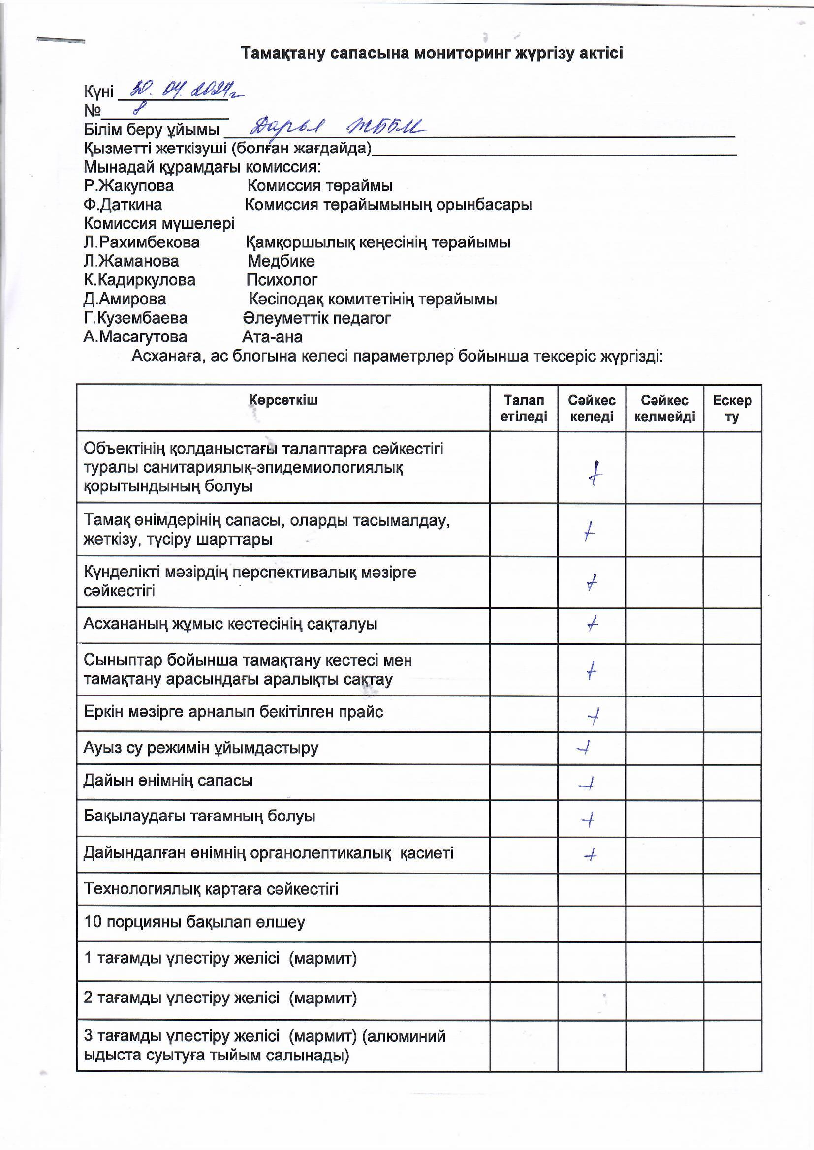 2024 жылдың 30 сәуір күні бракераж комиссиясы тамақтану сапасына мониторинг актісін жүргізді