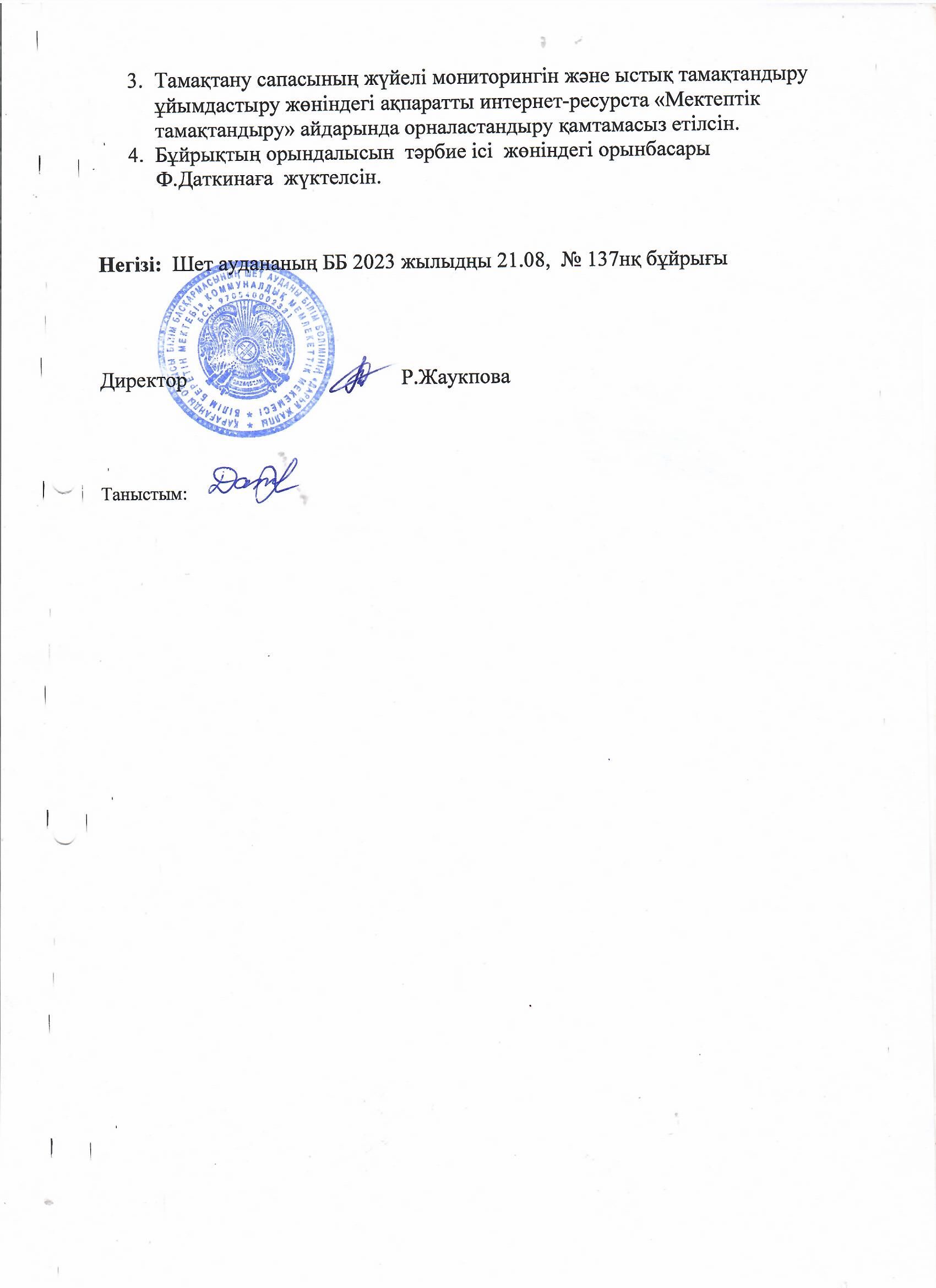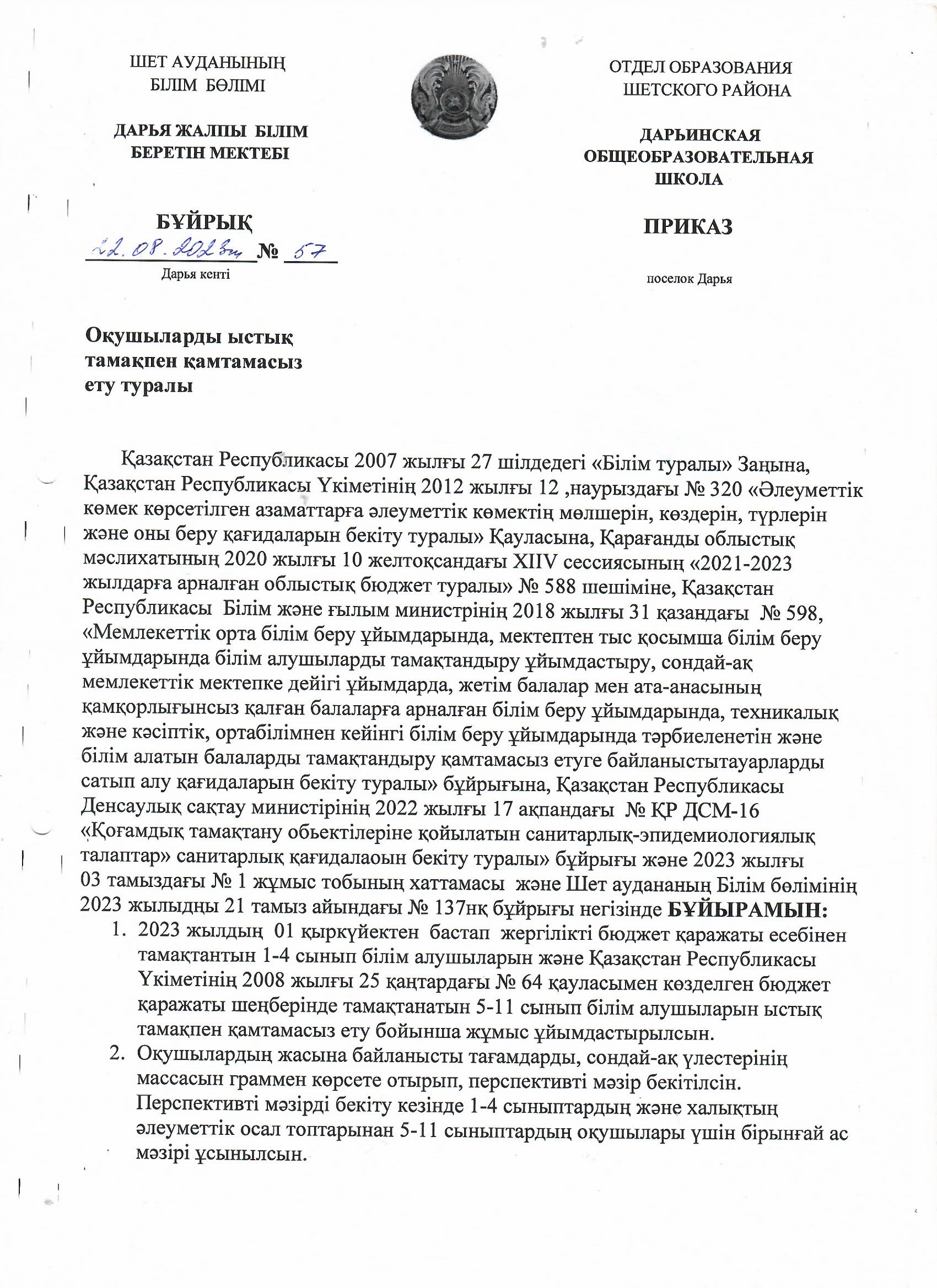 2023-2024 оқу жылындағы оқушыларды ыстық тамақпен қамту туралы бұйрық