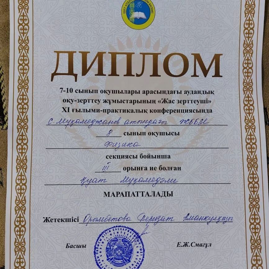 Шет білім бөліміне қарасты "С.Мұқамеджанов атындағы ЖББМ " КММ 3-4 сыныптар арасында өткізілген "Алтын сақа" олимпиаданың аудандық кезеніне қатысқан үшін 4а сынып оқушысы А…
