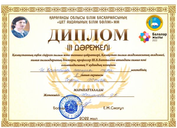 Ш.Батталова атындағы тірек мектебінде өткізілген Қазақ ғылым академиясының академигі, химия ғылымдарының докторы, профессор Ш.Батталова атындағы V аудандық олимпиадада 8 "ұ&qu…