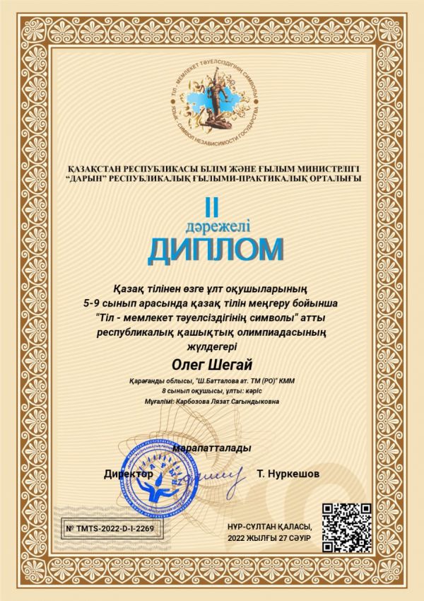 Қарағанды облысы, Шет ауданы Ш.Батталова атындағы ТМ (РО)ның 7 А сынып оқушысы Касымова Алима 22 қыркүйек 2-7-сынып оқушыларына арналған Республикалық ұлттық «Зерде» балалардың зерттеу ж…