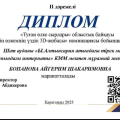13.10.23 күні өткен "Менің өлкемнің үздік 3 D-жобасы" номинациясы бойынша мектебіміздің мұражай жетекшісі Айгерім Шакаримовна жеңімпаз атанып, ІІ дәрежелі Дипломмен марапатталды. Құттықтай…