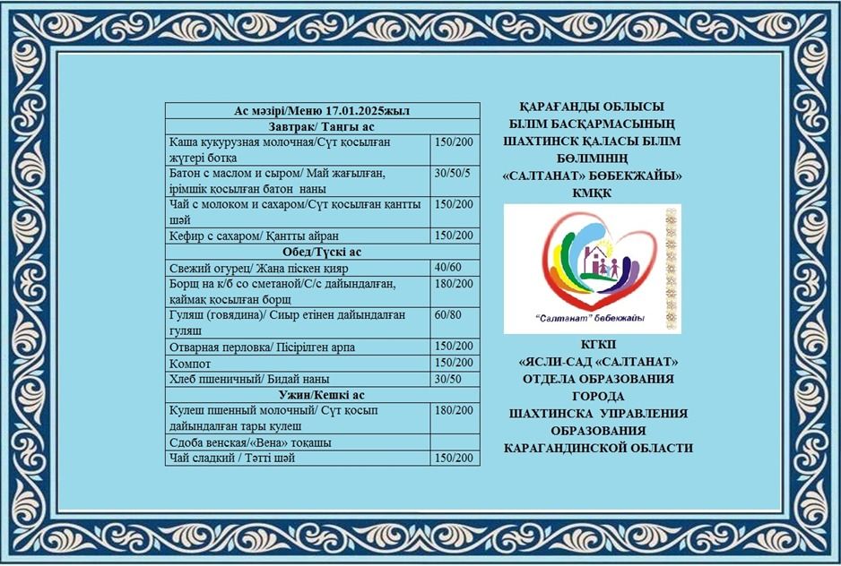 Сумма питания на 17.01.2025 составляет: на одного ребенка до 3 лет - 0.00 тенге; на одного ребенка с 3 до 6 лет - 0.00 тенге