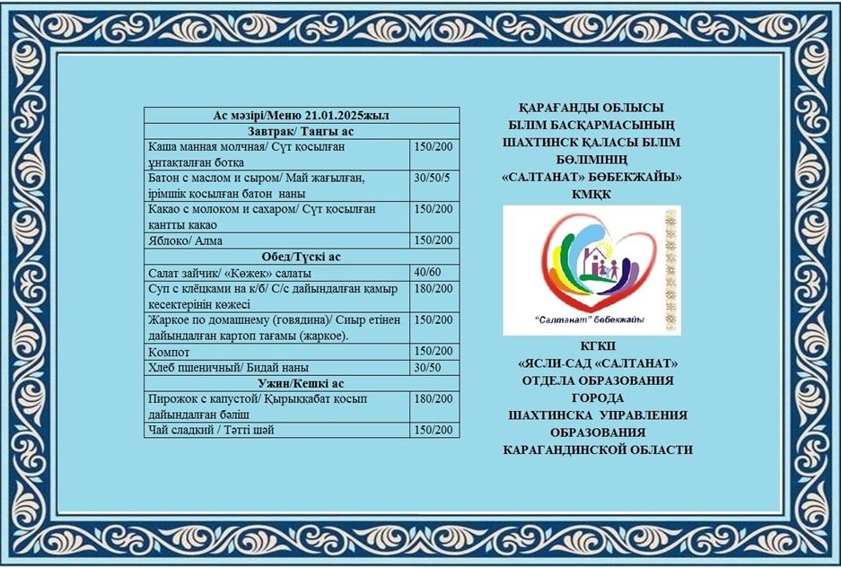 Сумма питания на 21.01.2025 составляет: на одного ребенка до 3 лет - 719.07 тенге; на одного ребенка с 3 до 6 лет - 816.34 тенге