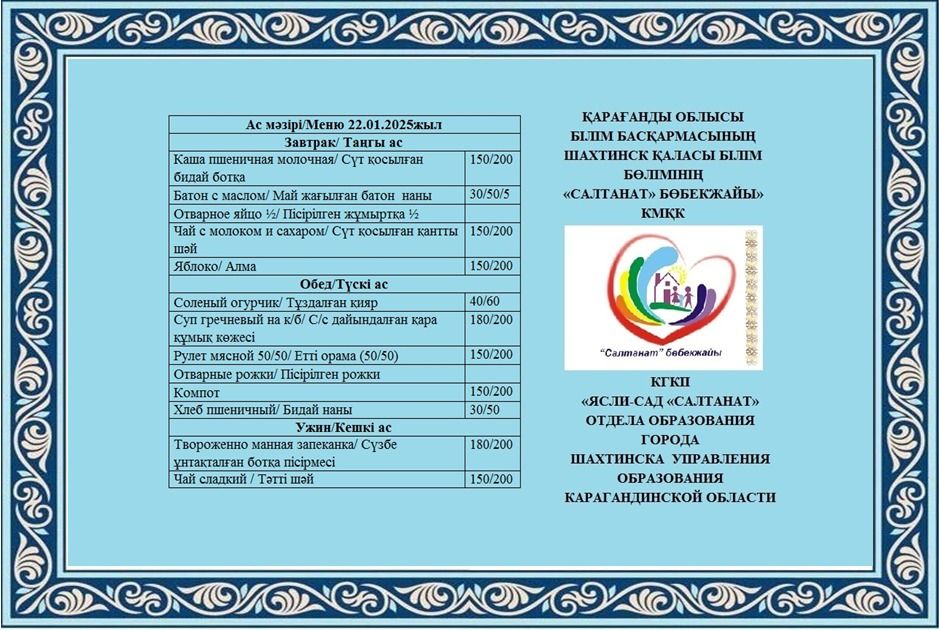 Сумма питания на 22.01.2025 составляет: на одного ребенка до 3 лет - 1100.00 тенге; на одного ребенка с 3 до 6 лет - 1200.82 тенге