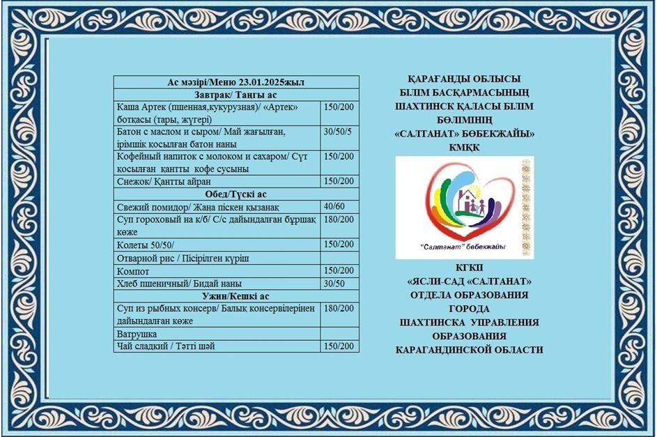 Сумма питания на 23.01.2025 составляет: на одного ребенка до 3 лет - 1115 тенге; на одного ребенка с 3 до 6 лет - 1103 тенге