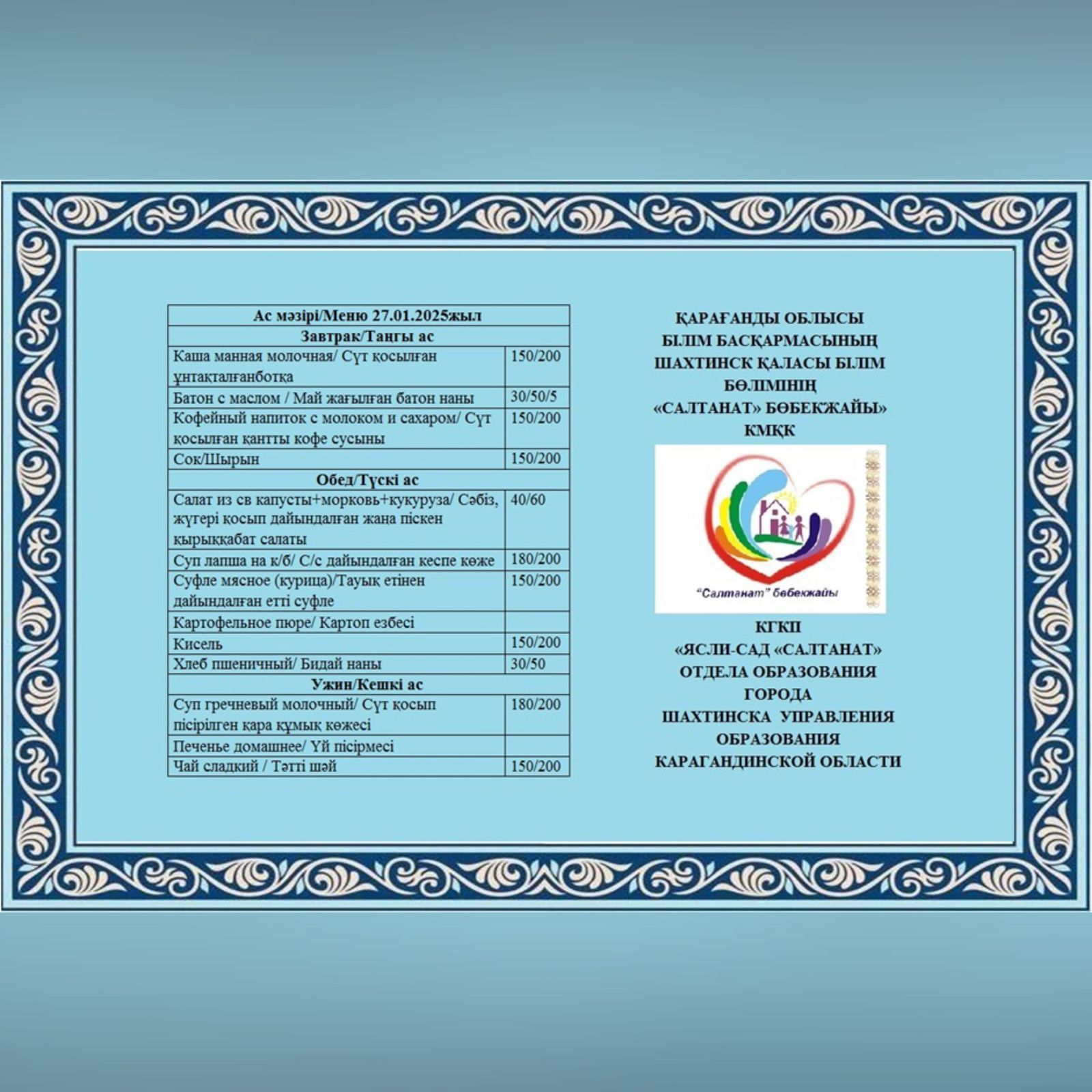 Сумма питания на 27.01.2025 составляет: на одного ребенка до 3 лет - 626.96 тенге; на одного ребенка с 3 до 6 лет - 736.79 тенге