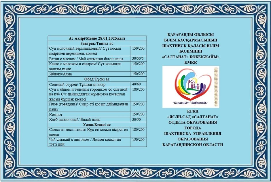 Сумма питания на 28.01.2025 составляет: на одного ребенка до 3 лет - 734.62 тенге; на одного ребенка с 3 до 6 лет - 894.30 тенге