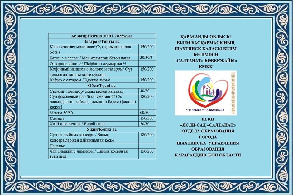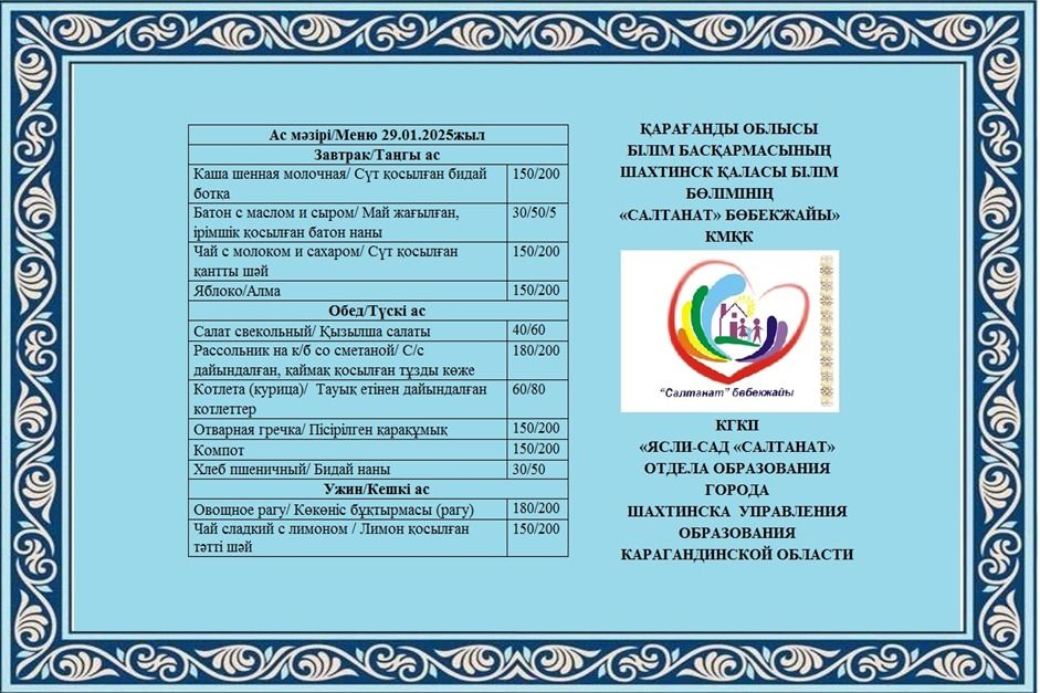 Сумма питания на 29.01.2025 составляет: на одного ребенка до 3 лет - 639.69 тенге; на одного ребенка с 3 до 6 лет - 727.42 тенге