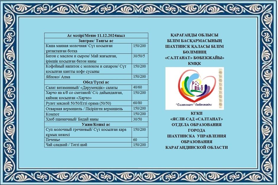 11.12.2024 жылға арналған тамақтану сомасы: 3 жасқа дейінгі бір балаға-631.54 теңге; 3 жастан 6 жасқа дейінгі бір балаға-750.90 теңге