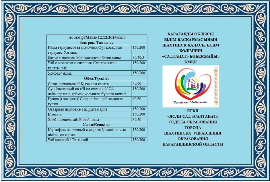 12.12.2024 жылға арналған тамақтану сомасы: 3 жасқа дейінгі бір балаға - 717.54 теңге; 3 жастан 6 жасқа дейінгі бір балаға - 851.99 теңге