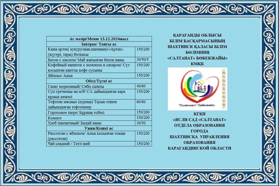 13.12.2024 жылға арналған тамақтану сомасы: 3 жасқа дейінгі бір балаға - 657.10 теңге; 3 жастан 6 жасқа дейінгі бір балаға - 773.18 теңге