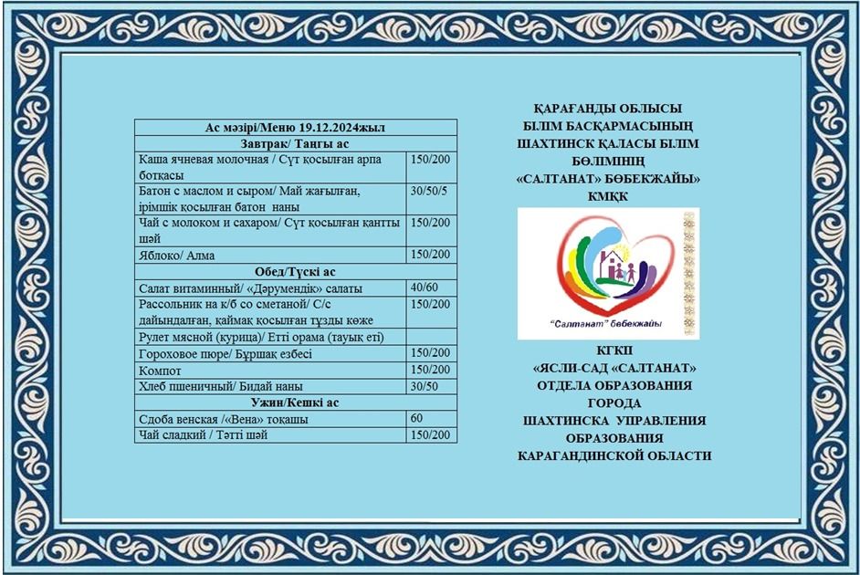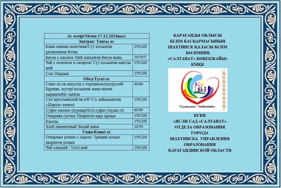 Салтанат бөбекжайы КМҚК 2024 жылдың 17 желтоқсанынан қарашасынан 2024 жылдың 30 желтоқсанына дейінгі болашақ екі апталық мәзірі №. 01-85