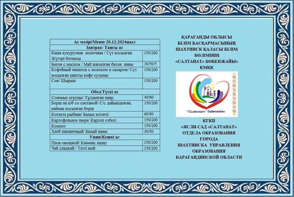 20.12.2024 жылға арналған тамақтану сомасы: 3 жасқа дейінгі бір балаға - 753.45 теңге; 3 жастан 6 жасқа дейінгі бір балаға - 830.65 теңге