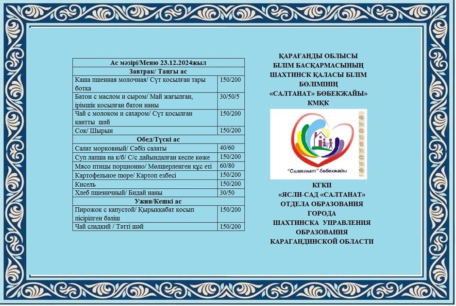 23.12.2024 жылға арналған тамақтану сомасы: 3 жасқа дейінгі бір балаға - 554.40 теңге; 3 жастан 6 жасқа дейінгі бір балаға - 665.25 теңге