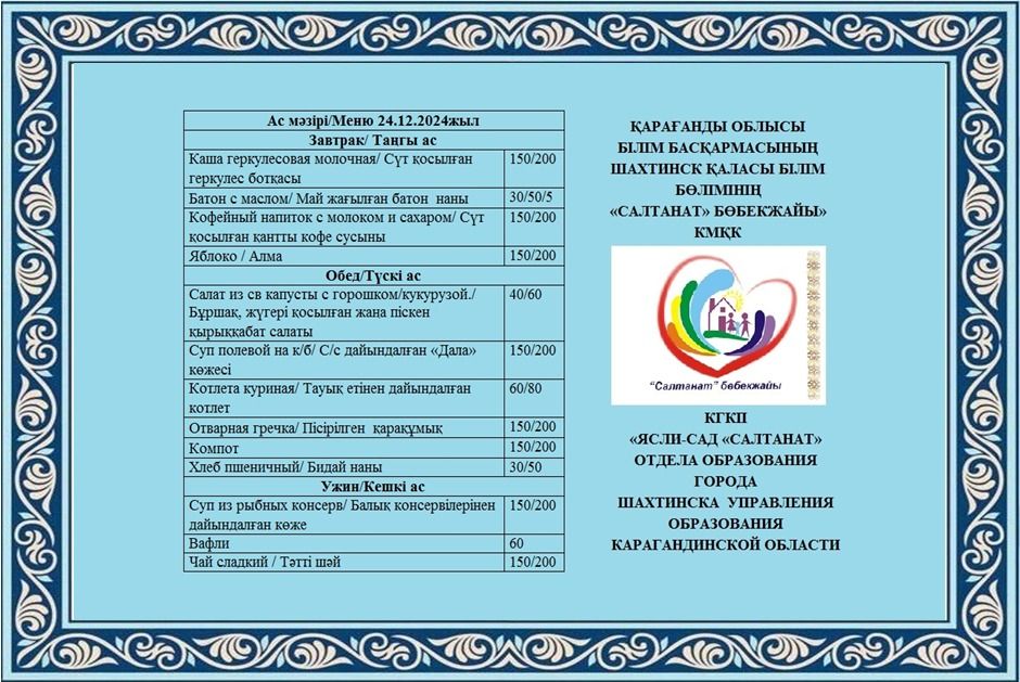 24.12.2024 жылға арналған тамақтану сомасы: 3 жасқа дейінгі бір балаға - 641.71 теңге; 3 жастан 6 жасқа дейінгі бір балаға - 719.12 теңге