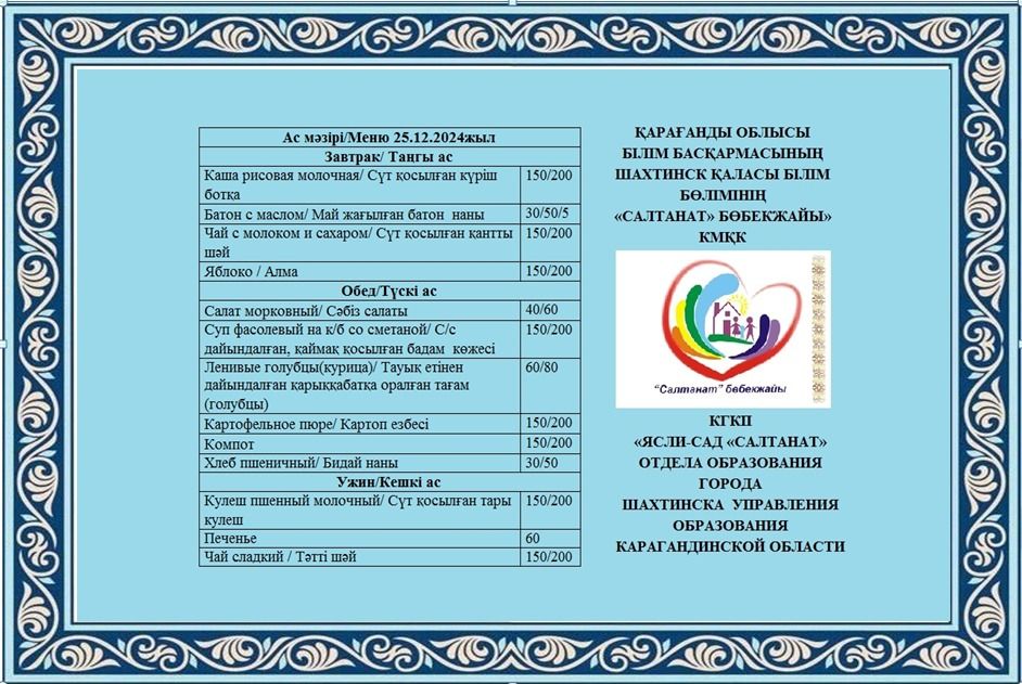 25.12.2024 жылға арналған тамақтану сомасы: 3 жасқа дейінгі бір балаға - 640.38 теңге; 3 жастан 6 жасқа дейінгі бір балаға - 744.97 теңге