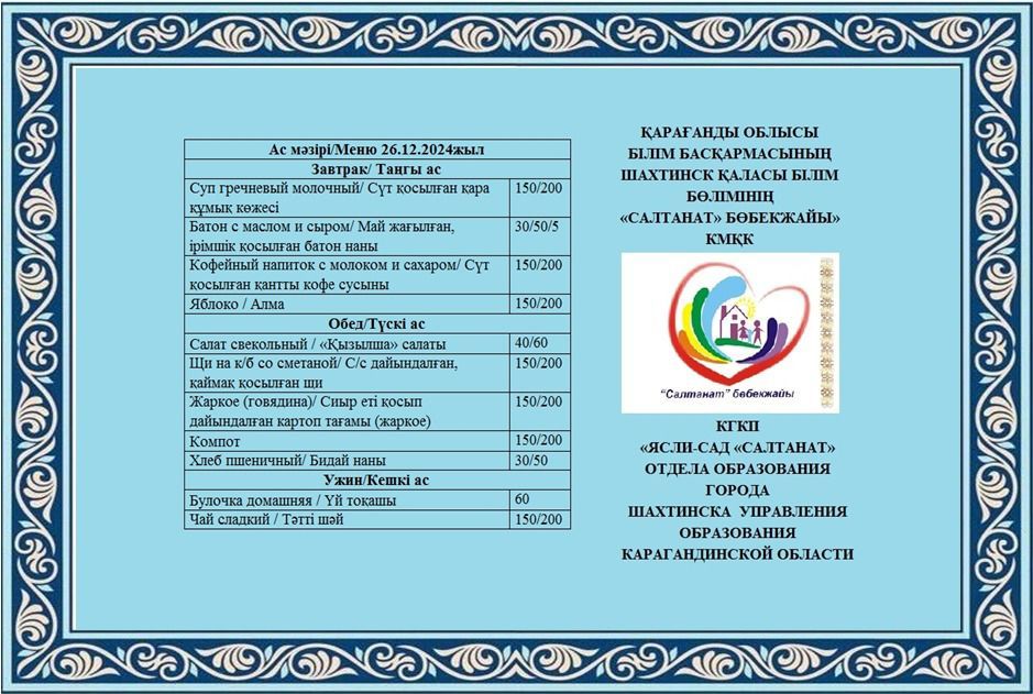26.12.2024 жылға арналған тамақтану сомасы: 3 жасқа дейінгі бір балаға - 670.35 теңге; 3 жастан 6 жасқа дейінгі бір балаға - 801.57 теңге