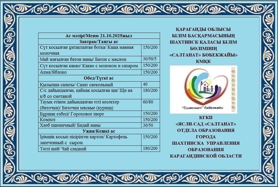 Сумма питания на 21.10.2025 составляет: на одного ребёнка до 3 лет - 605.76 тенге; на одного ребенка с 3 до 6 лет - 707.32 тенге