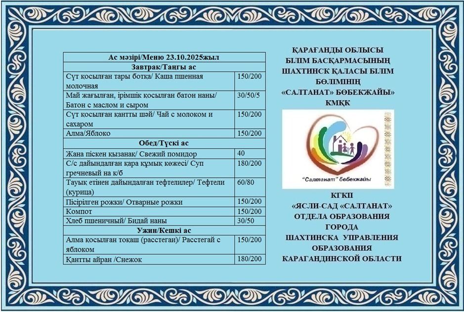 Сумма питания на 01.10.2025 составляет: на одного ребёнка до 3 лет - 626.73 тенге; на одного ребенка с 3 до 6 лет - 751.50 тенге