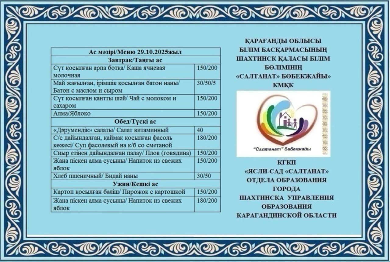 Сумма питания на 29.10.2025 составляет: на одного ребёнка до 3 лет - 709.98 тенге; на одного ребенка с 3 до 6 лет - 817.51 тенге