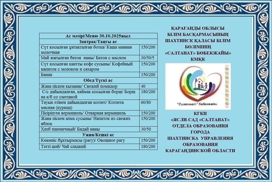 Сумма питания на 30.10.2025 составляет: на одного ребёнка до 3 лет - 712.28 тенге; на одного ребенка с 3 до 6 лет - 733.54 тенге