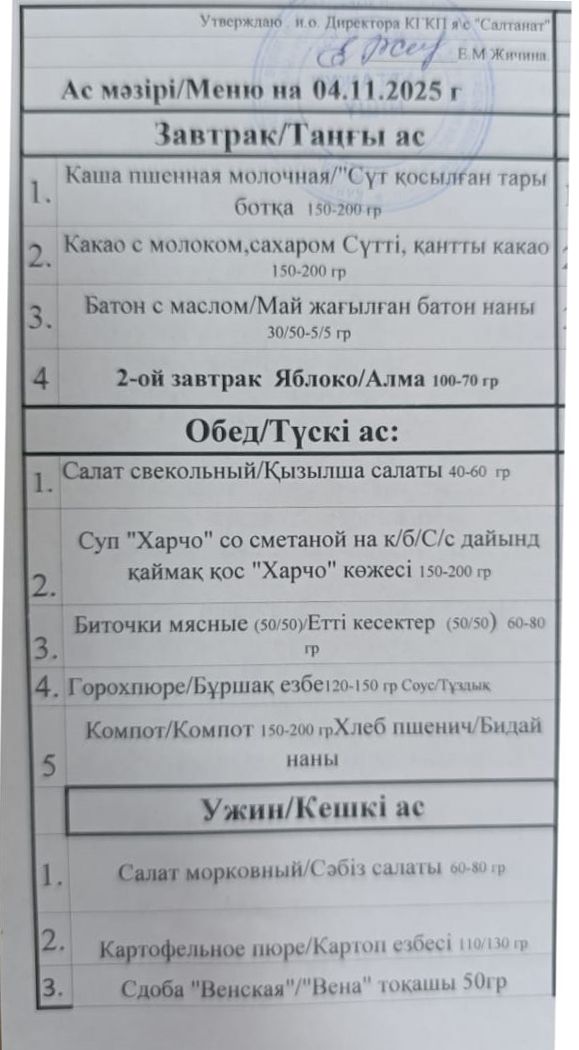 Сумма питания на 04.11.2025 составляет: на одного ребёнка до 3 лет - 683.03 тенге; на одного ребенка с 3 до 6 лет - 777.95 тенге