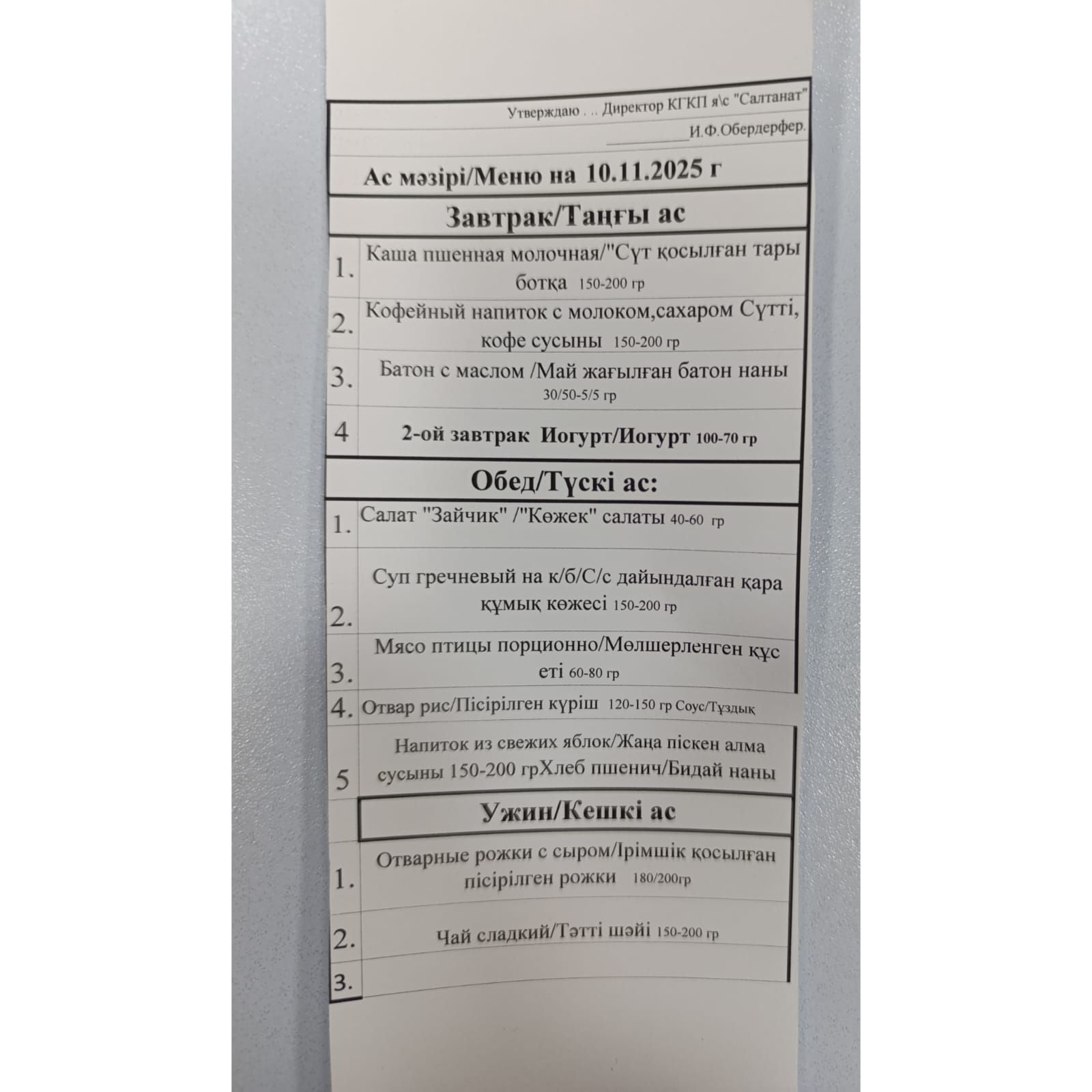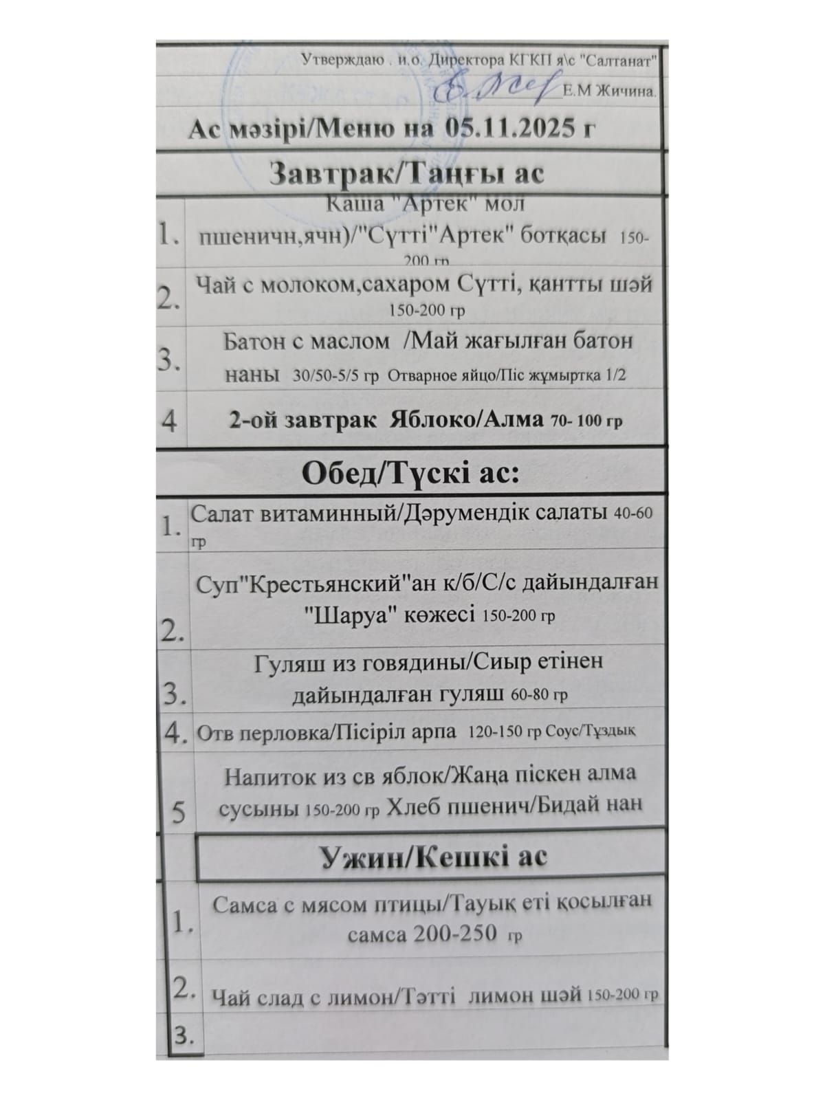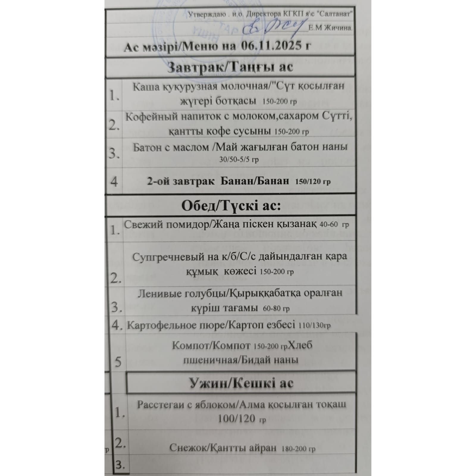 Сумма питания на 05.11.2025 составляет: на одного ребёнка до 3 лет - 776.67 тенге; на одного ребенка с 3 до 6 лет - 929.61 тенге