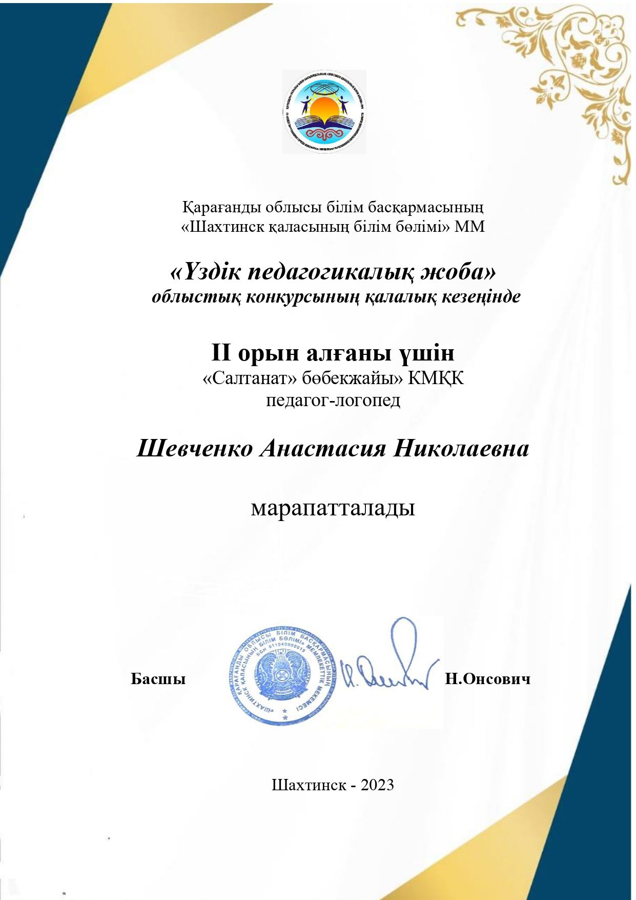 II орын - логопед мұғалемі Шевченко Анастасия Николаевна