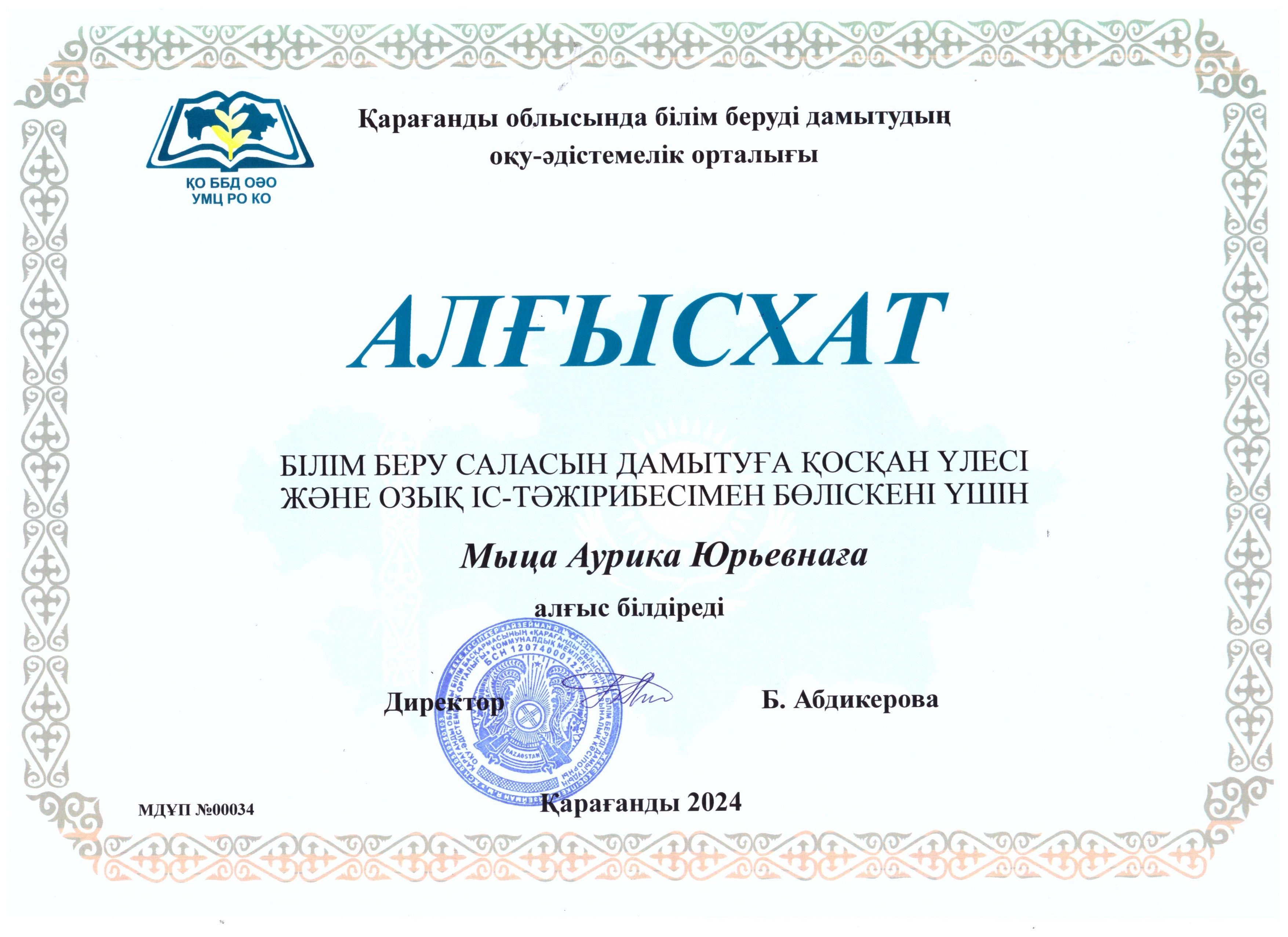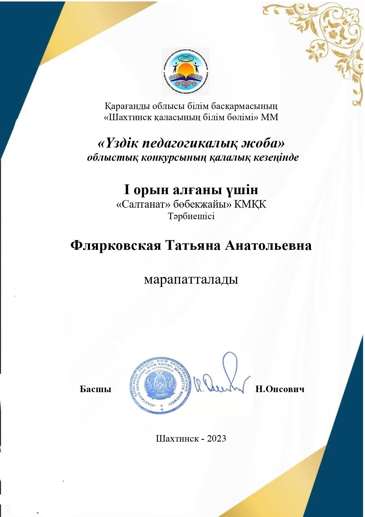 I орын - тәрбиеші Флярковская Татьяна Анатольевна