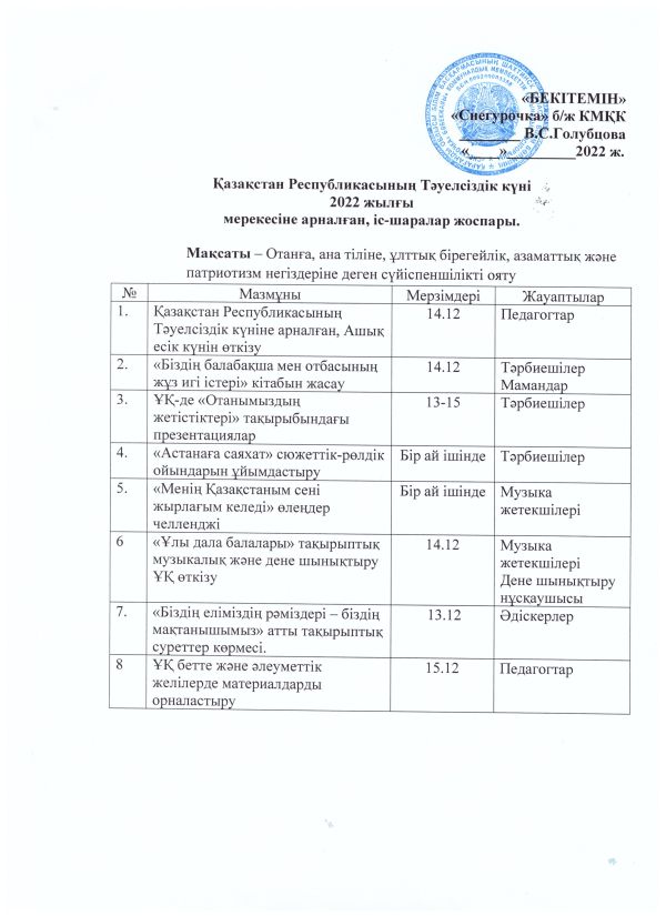 План мероприятий посвященный дню Независимости Республики Казахстан