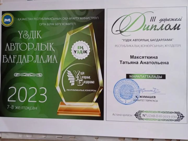Педагог-психолог Т. А. Максяткина Республикалық «Үздік авторлық багдарлама» байқауында 3 орынға ие болды.
