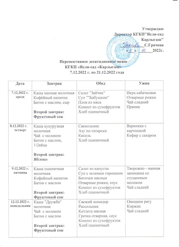 Перспективное десятидневное меню КГКП "Ясли- сад "Карлыгаш" с 26.10.2022 по 08.11.2022 года