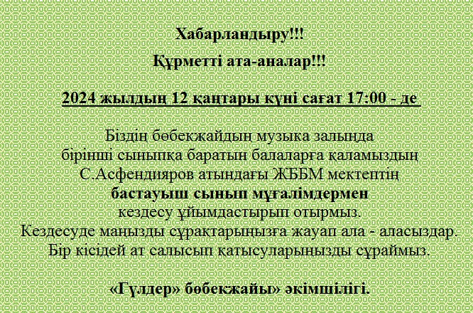 2024 жылдың 12 қаңтар күні, біздің бөбекжайда бірінші сыныпқа баратын балаларға қаламыздың С.Асфендияров атындағы ЖББМ мектептің бастауыш сынып сынып мұғалімдерімен бірлесе ата-аналар жиналысы өтті.…