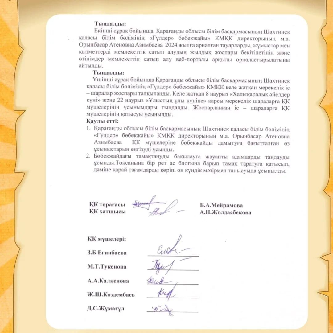 Құрметті қамқоршылық кеңесінің мүшелері! 2024 жылы 28 мамырда мектепке дейінгі ұйымның Қамқоршылық кеңесінің отырысы өтеді. Хатшы Жолдасбекова А.Н.