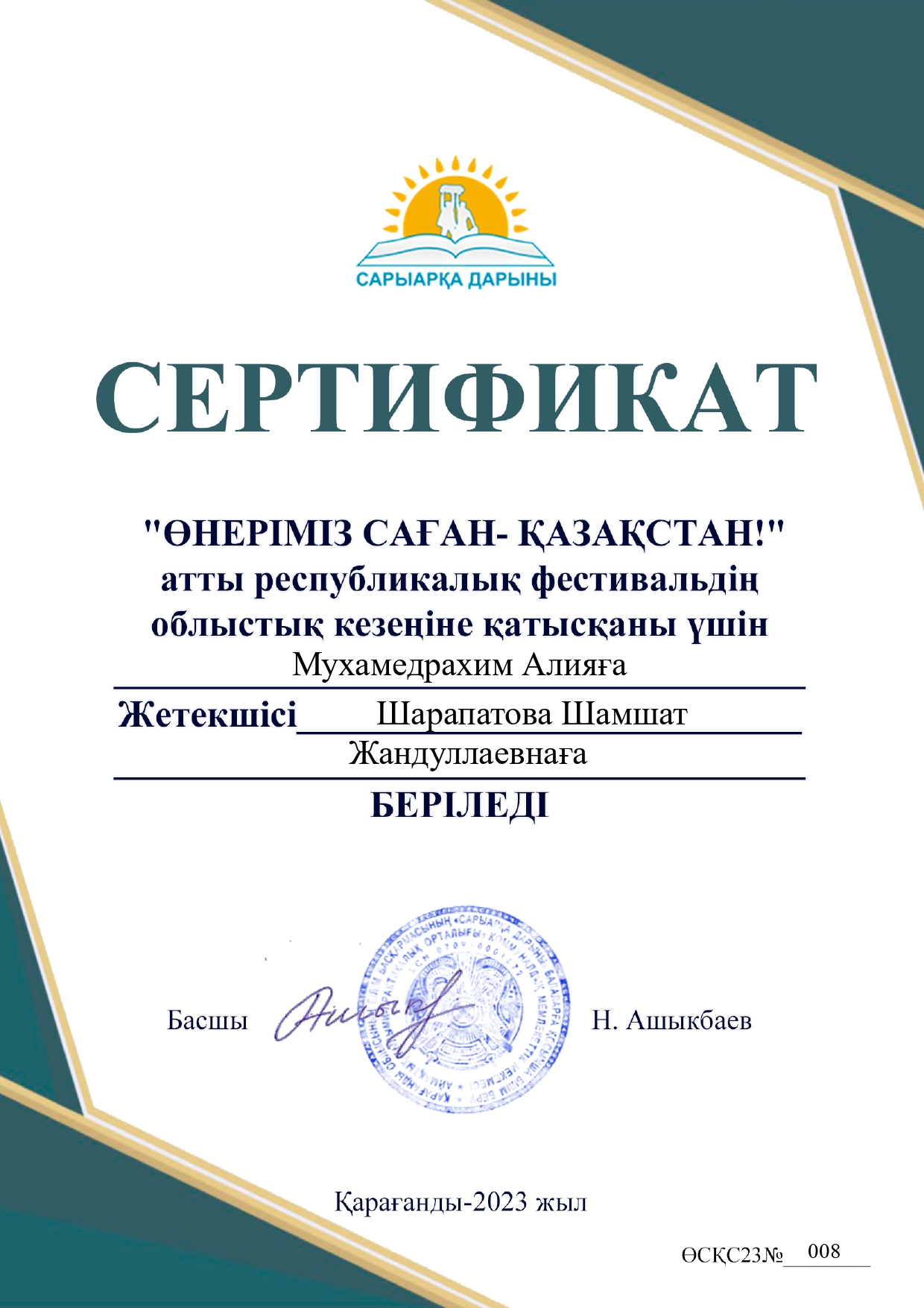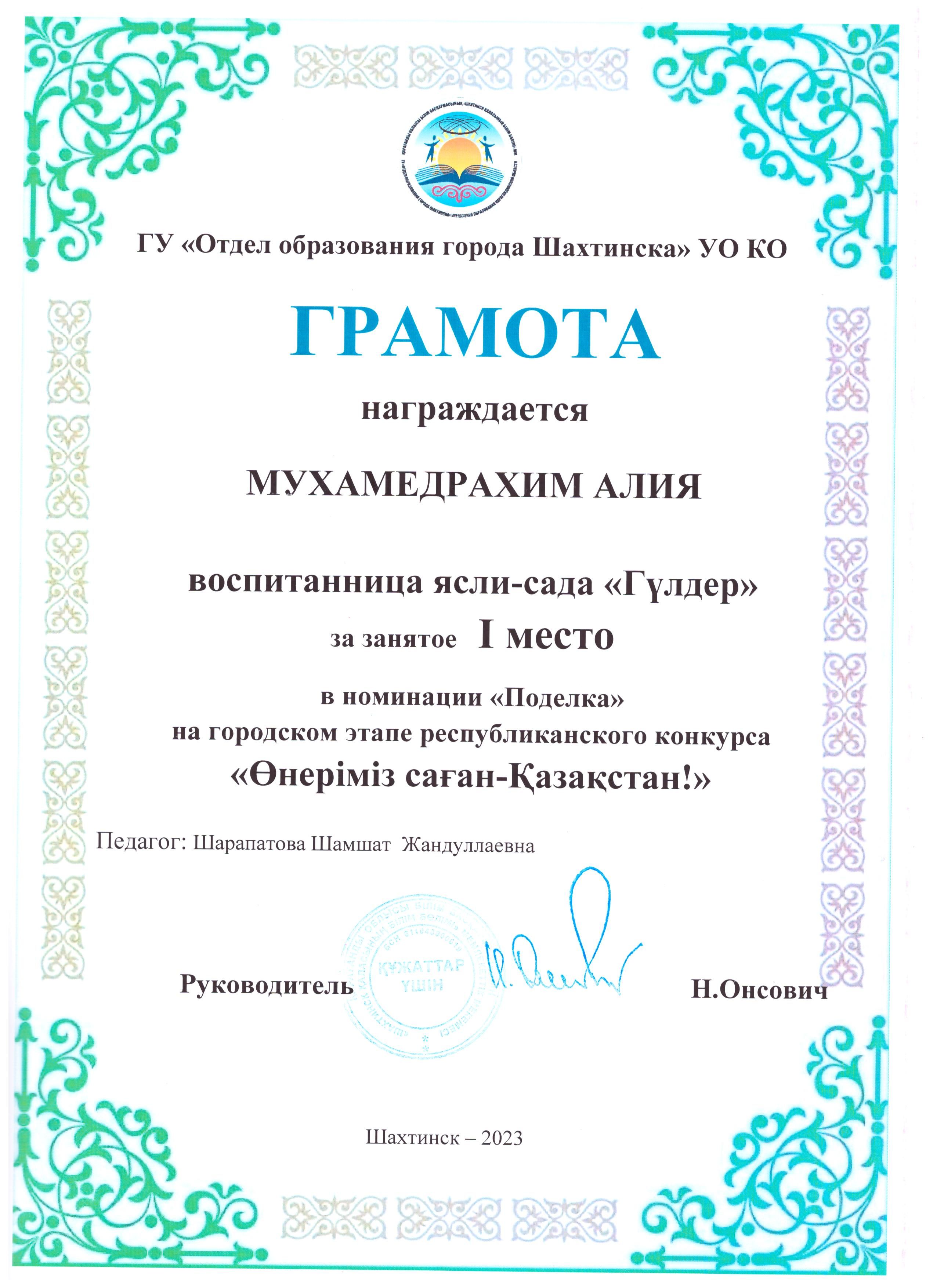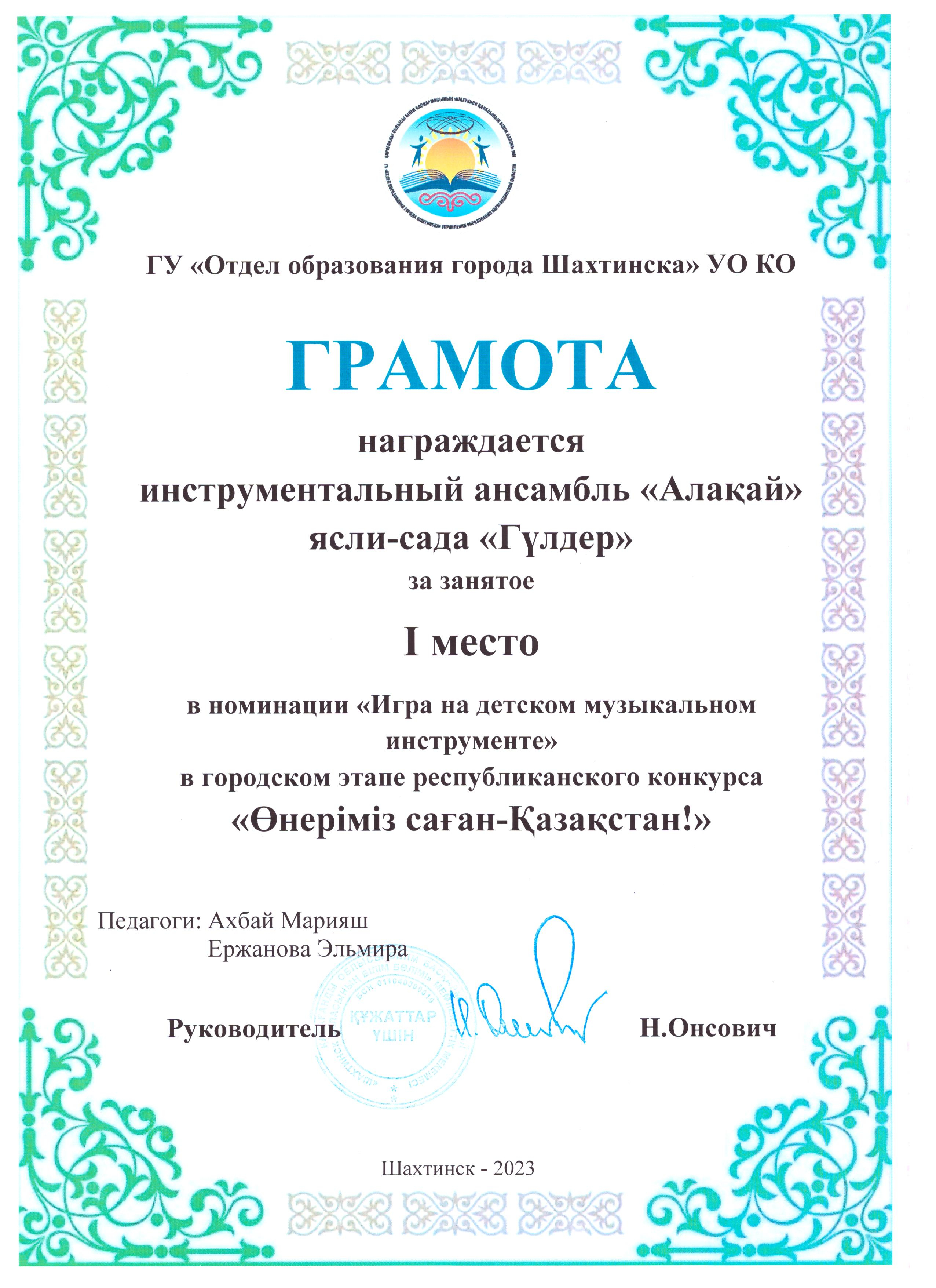 "Өнеріміз саған - Қазақстан" атты байқауға Қалалық этаптан 1 орын