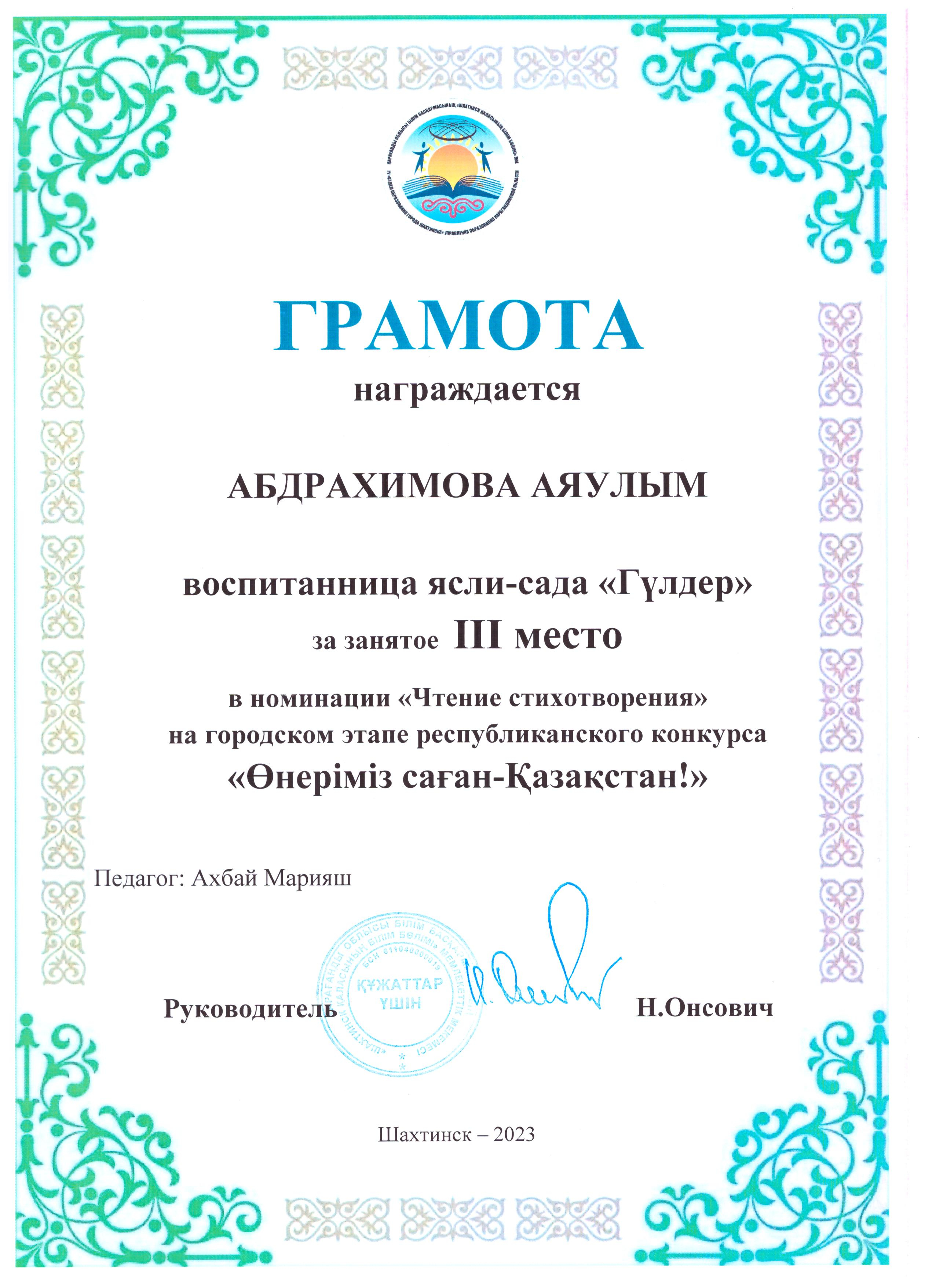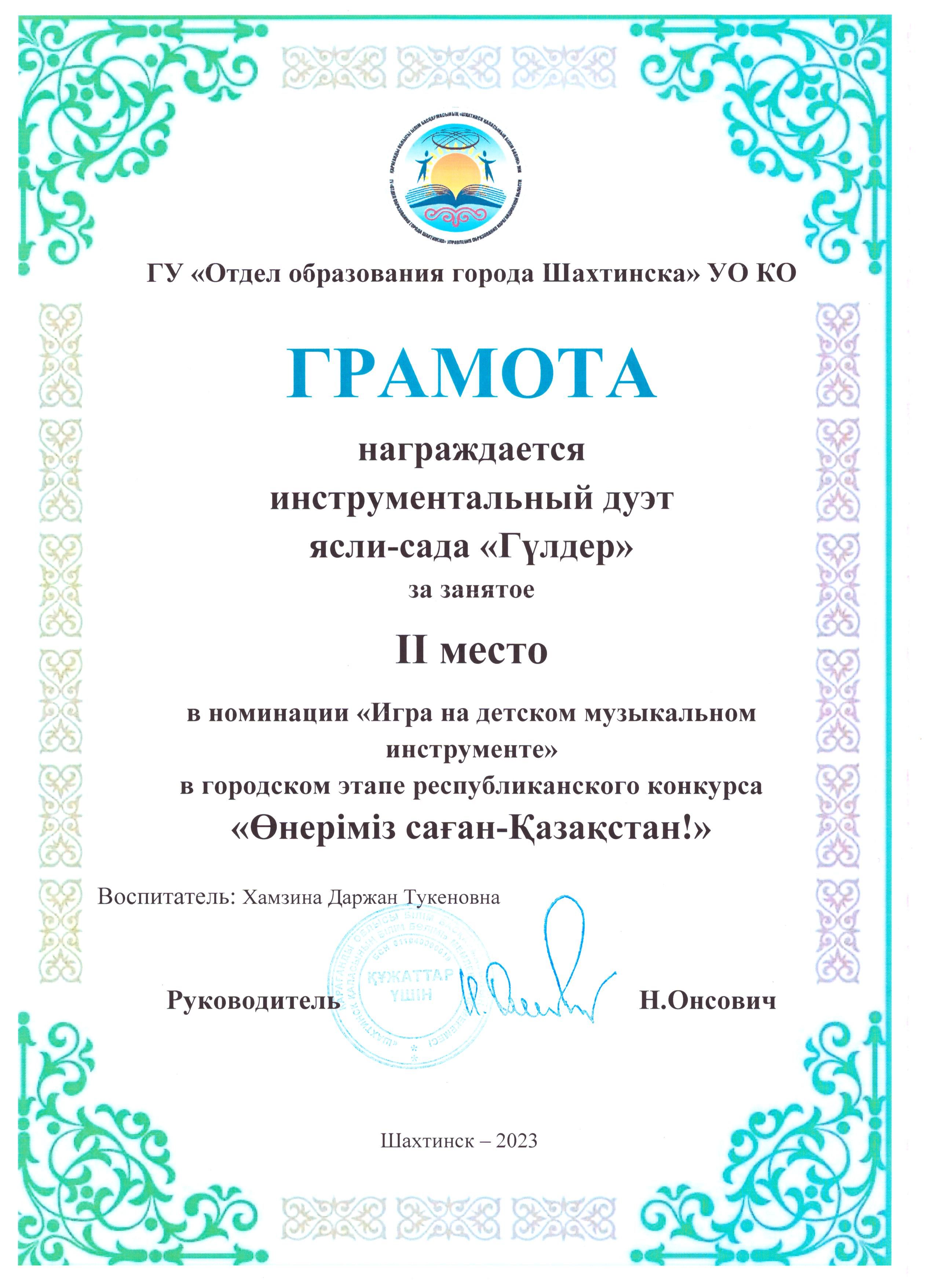 "Өнеріміз саған - Қазақстан" атты байқауда қалалық кезеңнен 2 орын