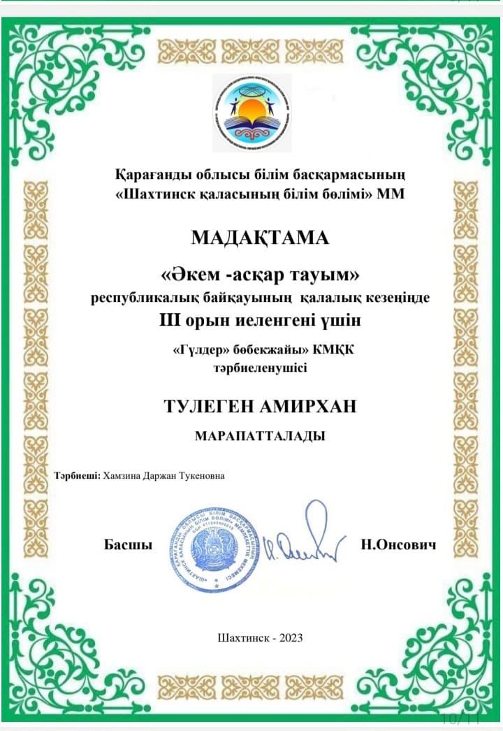"Қазақшаңыз қалай, балақай?" атты республикалық байқаудың қалалық кезеңінде қатысқаны үшін сертефикат