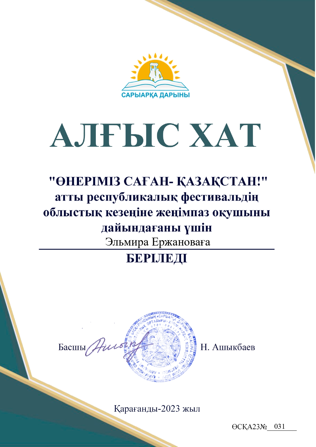 ҚАРАҒАНДЫ ОБЛЫСЫ БІЛІМ БАСҚАРМАСЫНЫҢ АЛҒЫС ХАТЫ