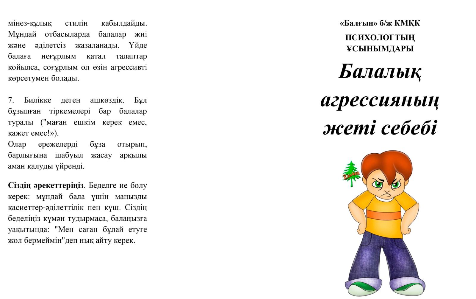 «Балғын» б/ж КМҚК ПСИХОЛОГТЫҢ ҰСЫНЫМДАРЫ Балалық агрессияның жеті себебі