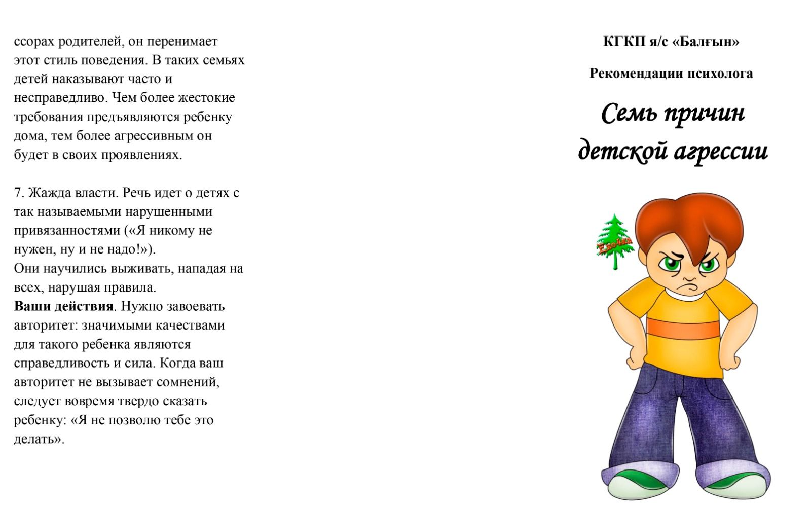 КГКП я/с «Балғын» Рекомендации психолога Семь причин детской агрессии
