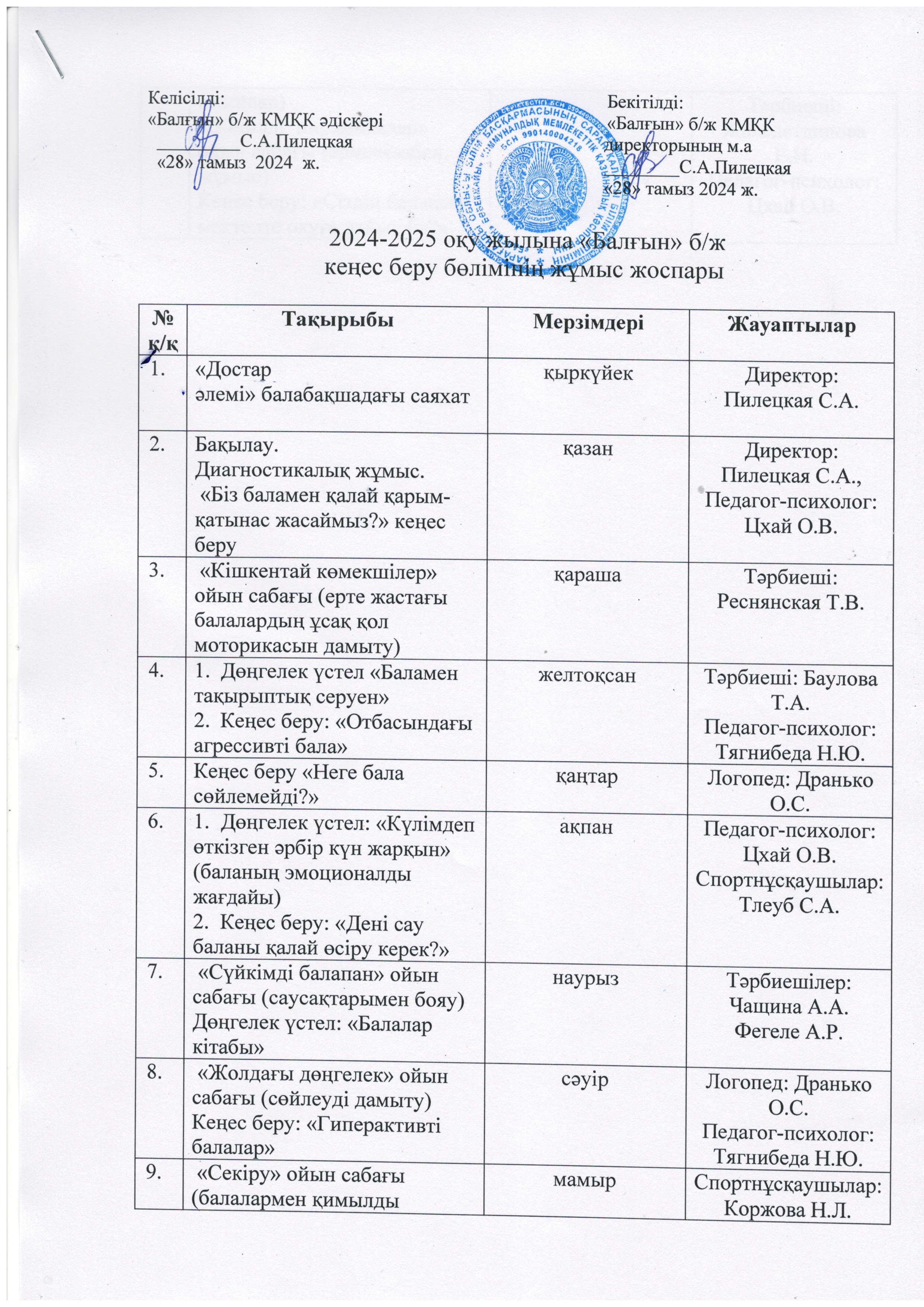 2024-2025 оқу жылына «Балғын» б/ж кеңес беру бөлімінің жұмыс жоспары