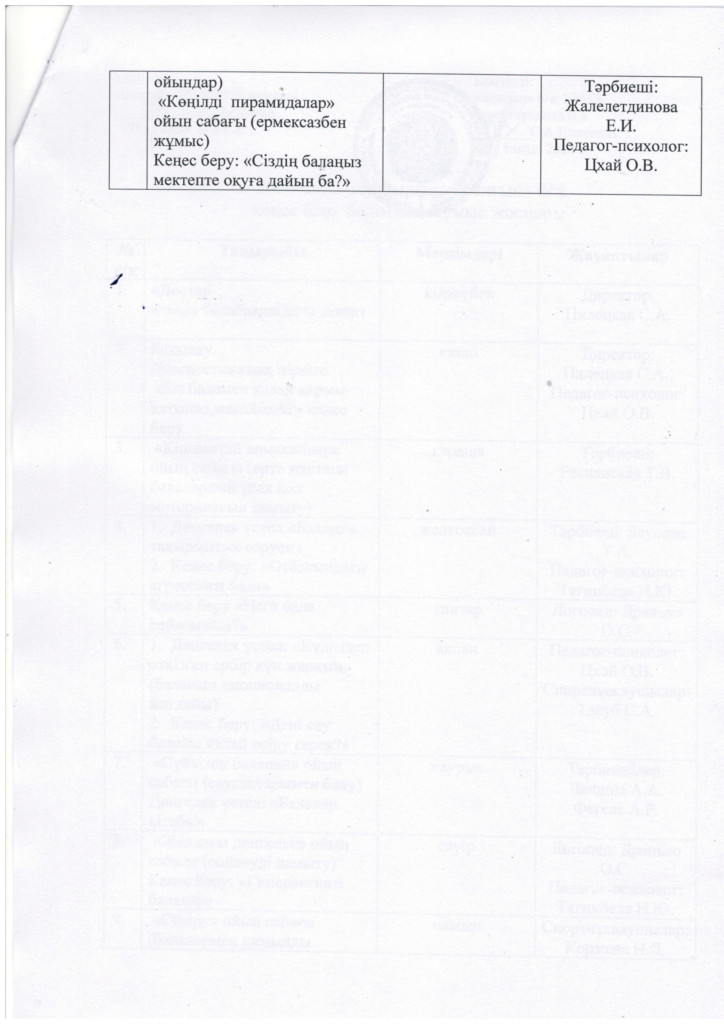 Мектепке дейінгі ұйымға бармайтық ата-анаралған Ашық есік кеңес беру пунктінің жылдық жоспарында мамандар мен педагогтармен консультациялар қарастырылған