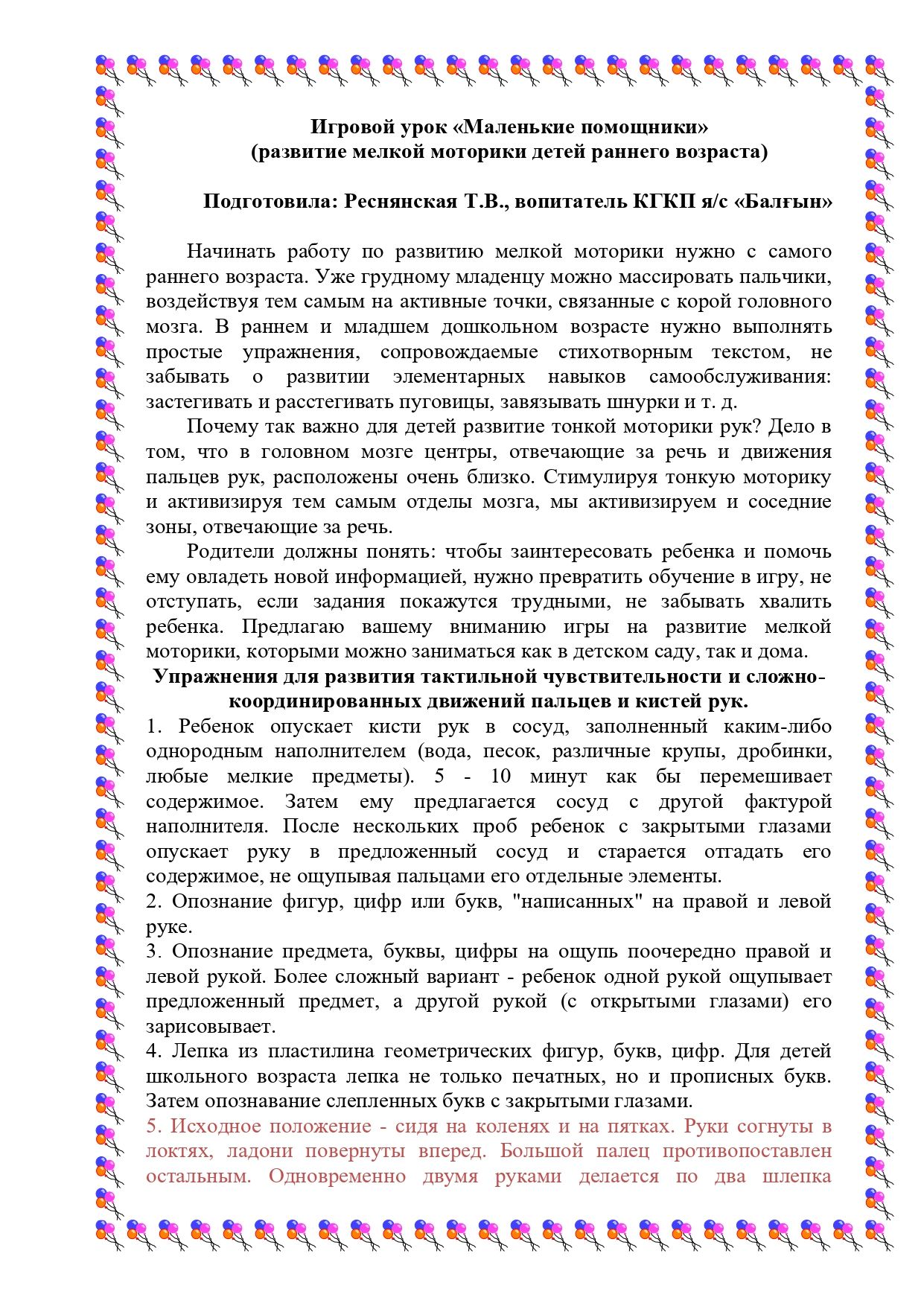 "Кішкентай көмекшілер" ойын сабағы (ерте жастағы балалардың ұсақ моторикасын дамыту)