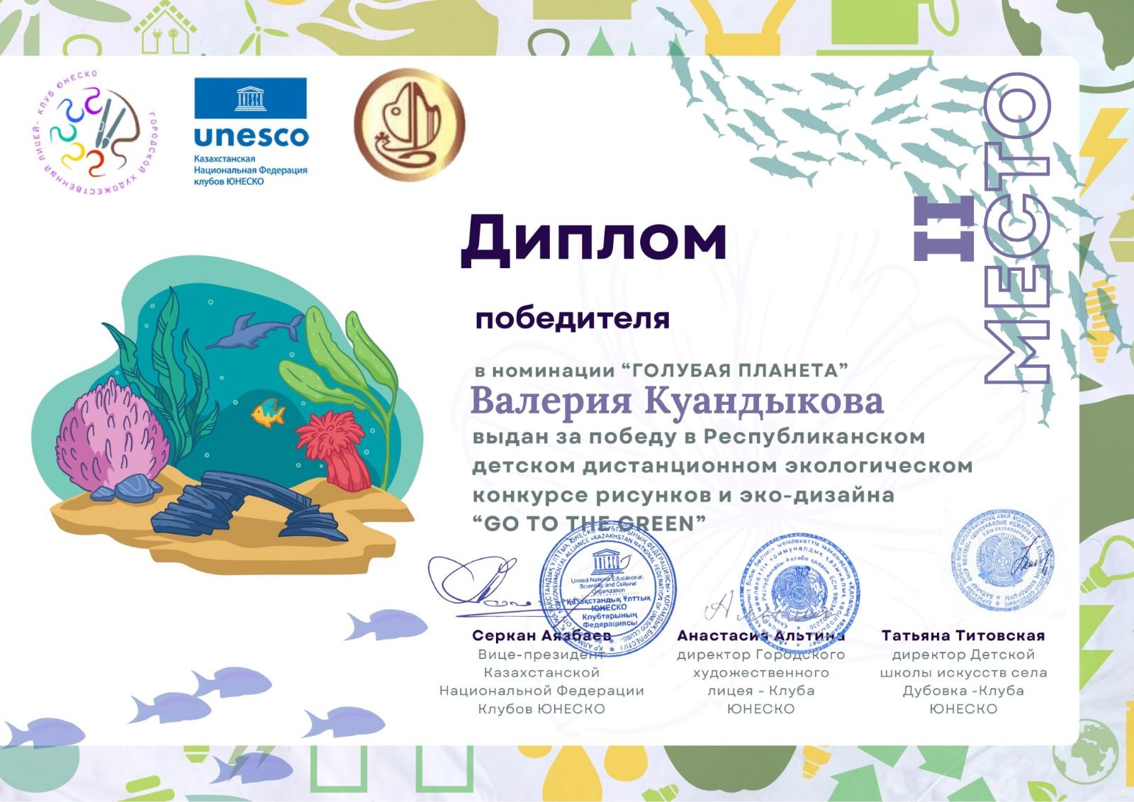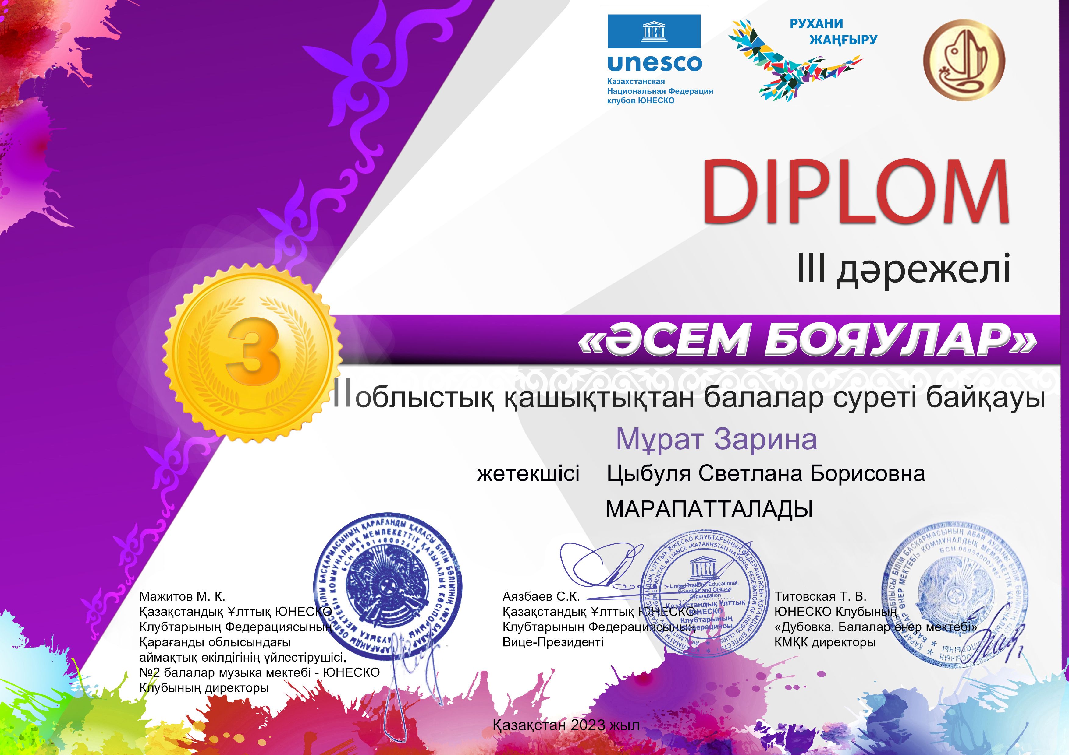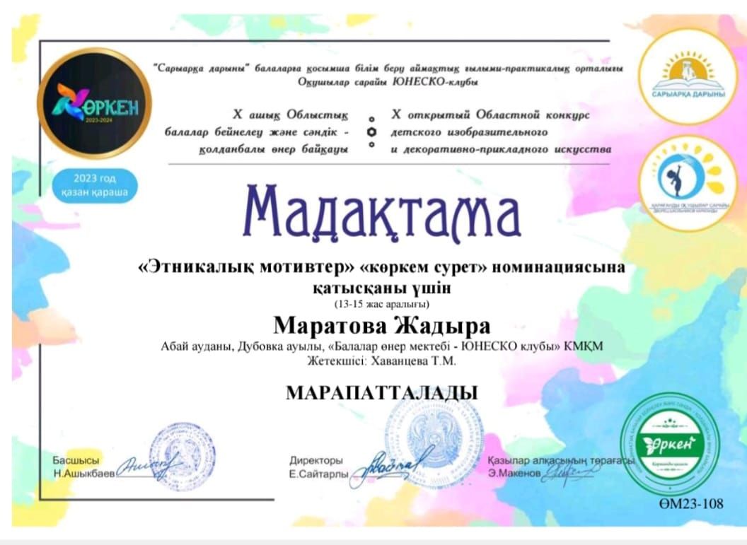Дипломом 2 степени награждается Вишеревич Мария за победу Республиканского конкурса изобразительного творчества посвященного Дню Независимости Республики Казахстан "Жасасын, Тәуелсіз Қазақстан&…