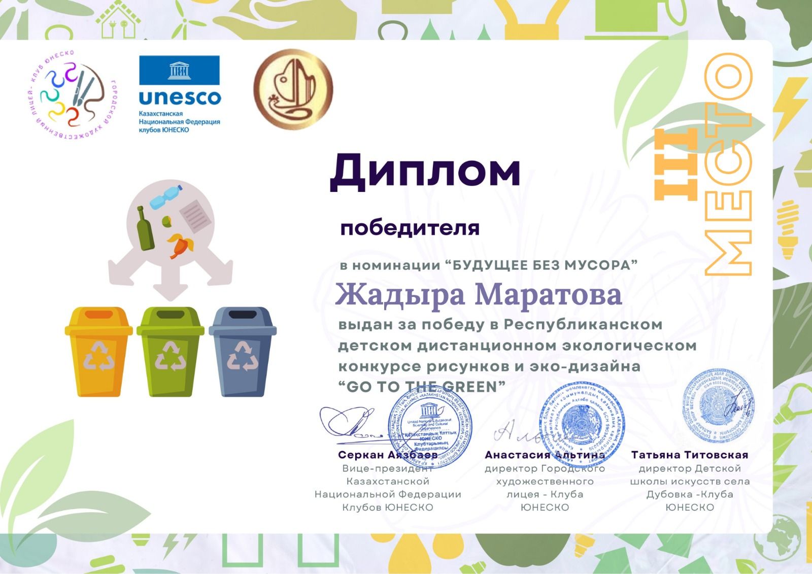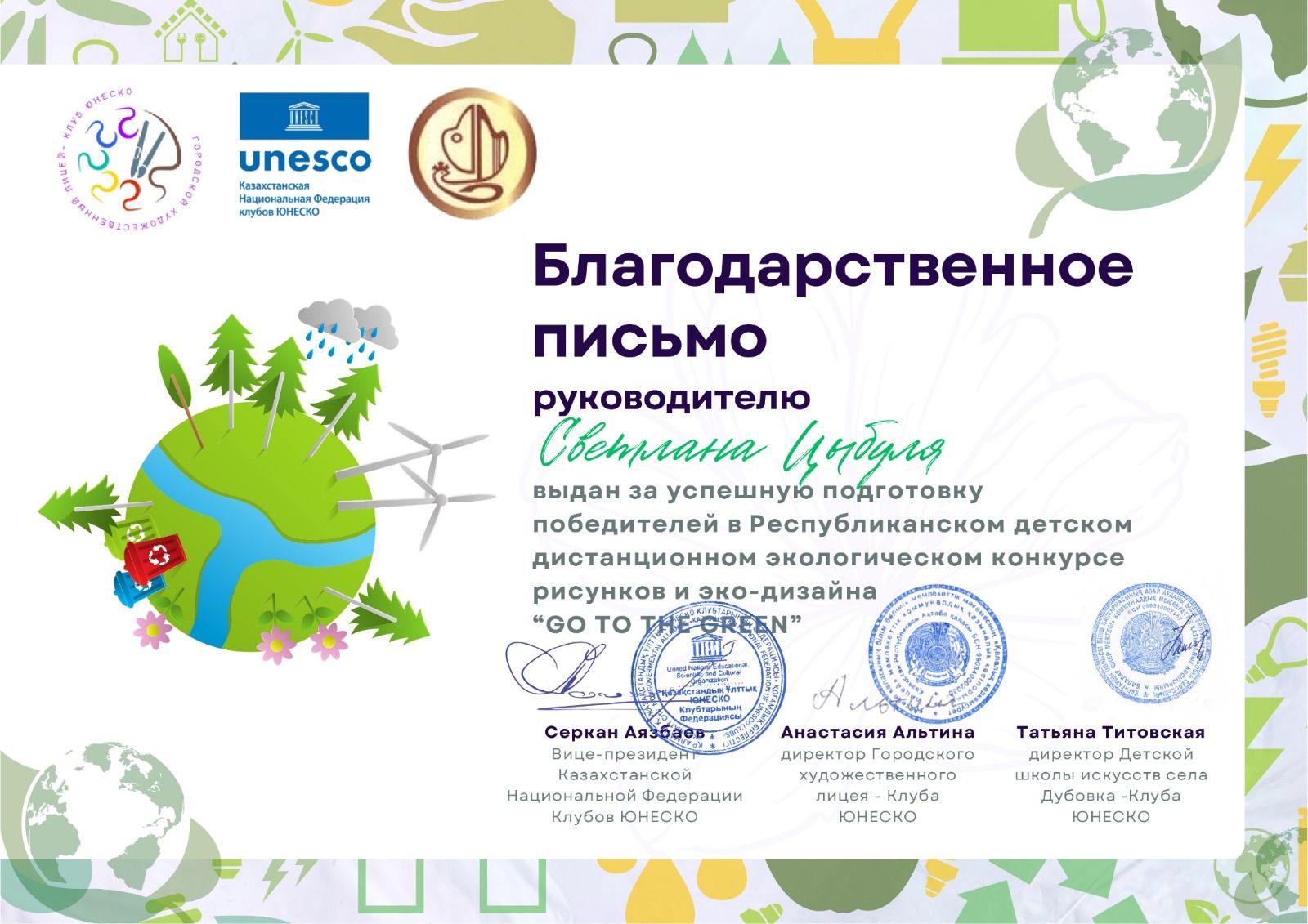 Республиканский детский дистанционный экологический конкурс рисунков и эко-дизайна "Go to the green" в кот.приняли участие 5 воспитанников ДШИ -клуб ЮНЕСКО с.Дубовка и заняли почетные мест…