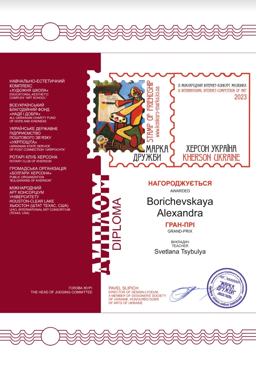 Поздравляем победителя Боричевскую Александру и ее руководителя педагога художественного отделения Цыбулю Светлану Борисовну с достойным занятым Гран-При местом в Международном конкурсе "Марка…