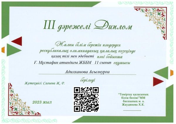 6. Адилханова Асылнур 11 сынып оқушысы - 3 орын қазақ тілі мен әдебиеті пәні бойынша - жетекшісі Сагиева Жадыра Рымбеков