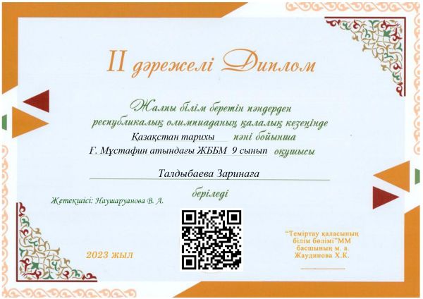 2. Талдыбаева Зарина 9 сынып оқушысы - 2 орын Қазақстан тарихы пәні бойынша – жетекшісі – Наушаруанова Валентина Адилхановна